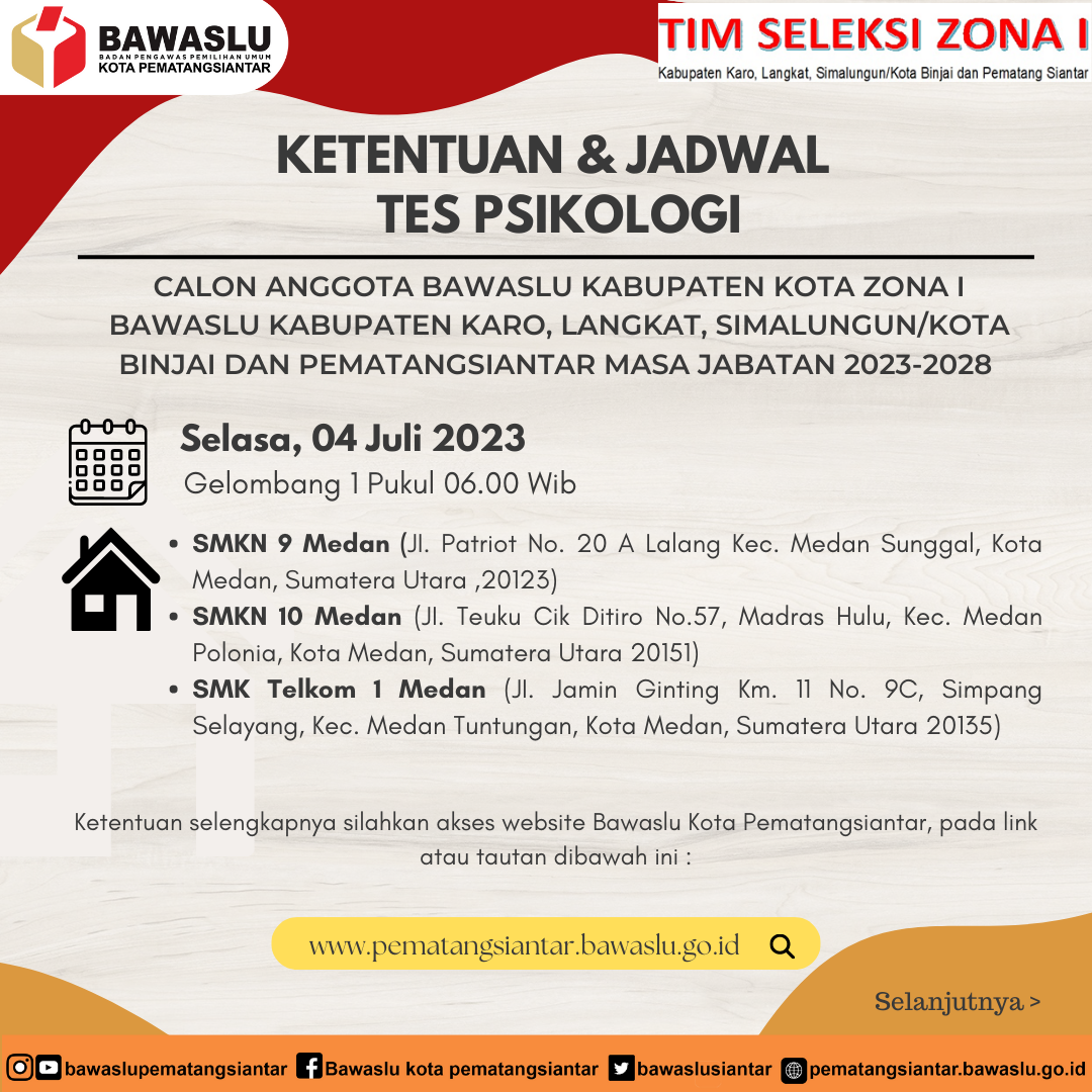 JADWAL PELAKSANAAN TES PSIKOLOGI BAWASLU KAB/KOTA ZONA 1 SUMATERA UTARA