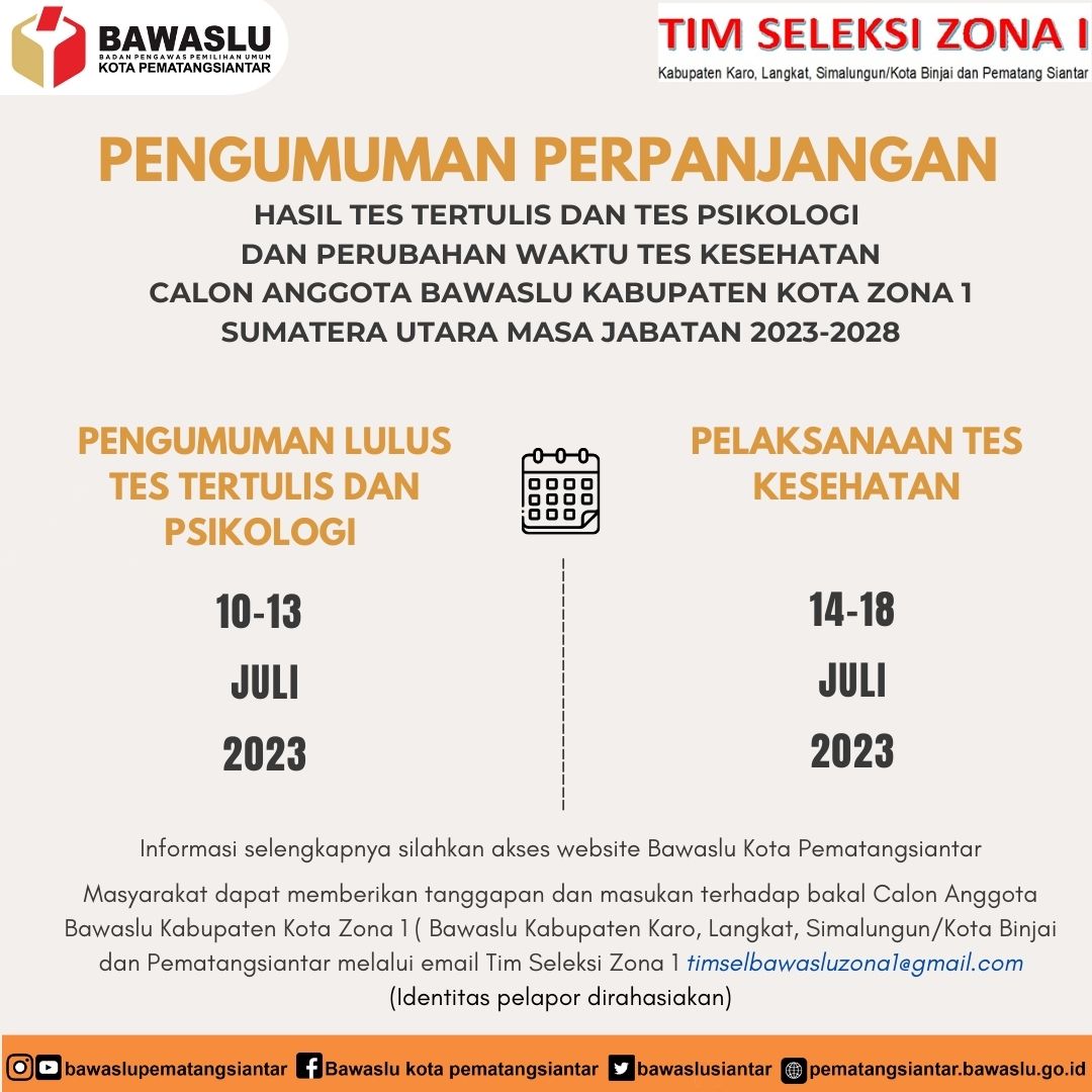 PERPANJANGAN PENGUMUMAN HASIL TES TERTULIS DAN TES PSIKOLOGI DAN PERUBAHAN WAKTU PELAKSANAAN TES KESEHATAN CALON ANGGOTA BAWASLU KABUPATEN KOTA ZONA 1 SUMATERA UTARA