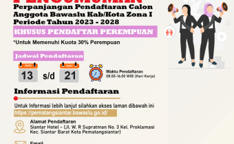 Pengumuman Perpanjangan Masa Pendaftaran Calon Anggota Bawaslu Kabupaten/Kota Zona I (Kabupaten Karo, Kabuopaten Langkat, Kabupaten Simalungun, Kota Binjai dan Kota Pematangsiantar) Nomor : 14/TIMSEL/Zona I/VI/2023