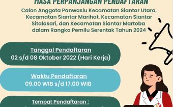 Pematang Siantar,- Keterwakilan 30 persen perempuan pendaftar pada Panitia Pengawas Kecamatan (Panwascam) belum terpenuhi, Badan Pengawas Pemilu (Bawaslu) Kota Pemtang Siantar, memperpanjang masa pendaftaran Panwascam,(01/10/2022).