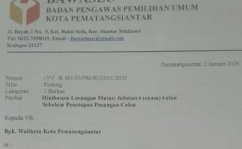 Pematangsiantar- Ketua Bawaslu Kota Pematangsiantar Muhammad Syahfii Siregar melalui surat nomor: 0011/K.SU-30/PM.00.02/01/2020 tertanggal 2 Januari 2020 mengimbau Wali Kota Pematangsiantar untuk tidak melakukan mutasi jabatan di lingkungan Pemko Pematangsiantar, enam bulan sebel