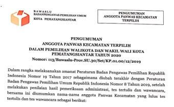 Pematangsiantar - Setelah melakukan tes tertulis secara online dan tes wawancara terhadap 132 peserta, Bawaslu Kota Pematangsiantar menetapkan 24 Anggota Panwascam Terpilih Pemilihan Wali Kota dan Wakil Wali Kota Pematangsiantar Tahun 2020.