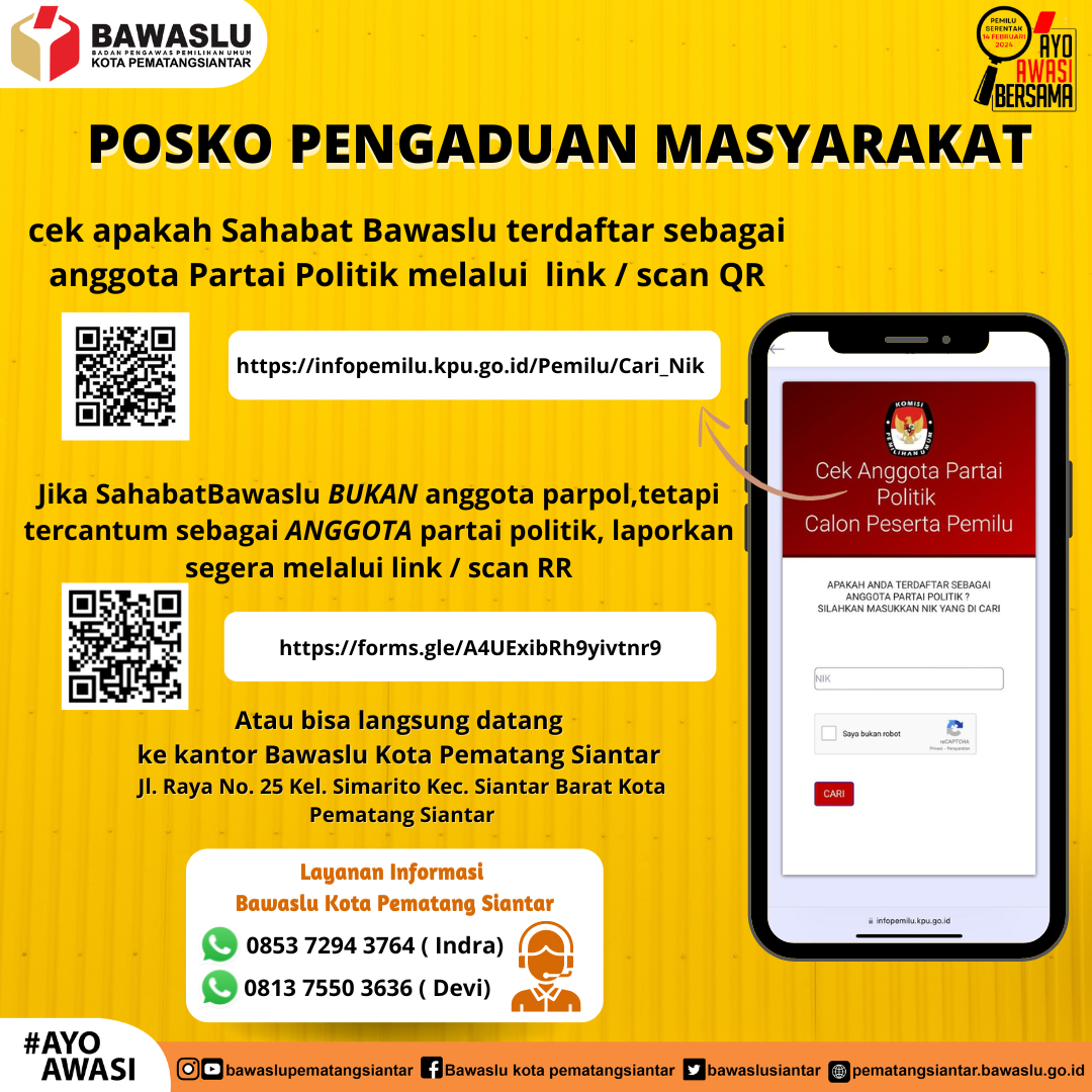 Selain membuka Posko Pengaduan Masyarakat, Bawaslu Kota Pematang Siantar juga menerbitkan surat Himbauan ke 8 Kecamatan dan 53 Kelurahan se Kota Pematang Siantar untuk melakukan pengecekan terkait keterdaftaran diri dalam keanggotaan atau kepengurusan partai politik.