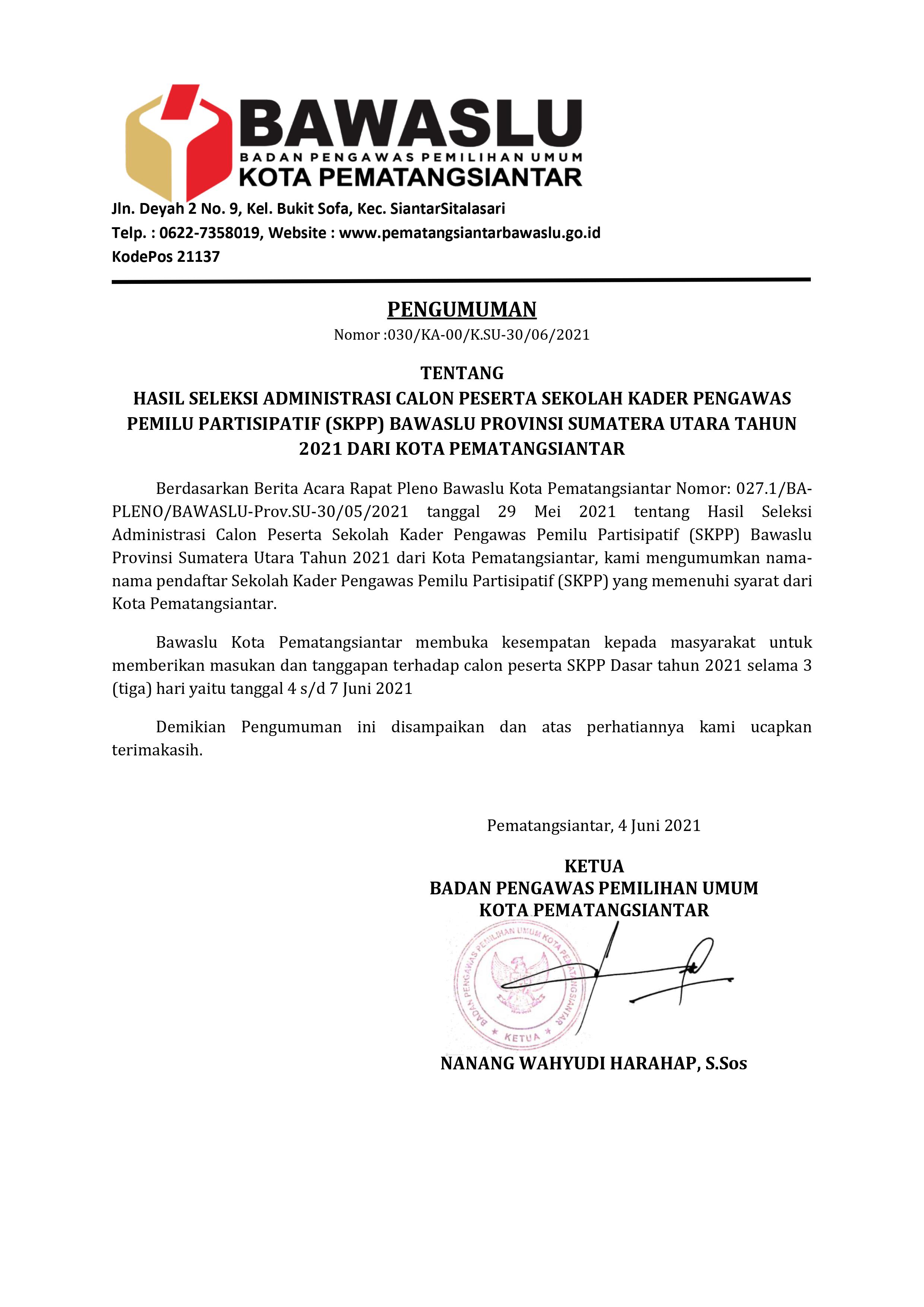 Bawaslu Kota Pematangsiantar mengharapkan tanggapan dan masukan dari Masyarakat Kota Pematangsiantar hingga tanggal 7 Juni 2021 atas Nama-nama Calon Peserta SKPP tersebut. Pengumuman dan Lampiran Pengumuman dapat DIUNDUH DISINI