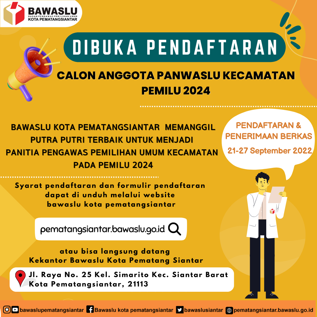 Dalam rangka pembentukan Panwaslu Kecamatan dalam Pemilu Serentak Tahun 2024, Kelompok Kerja Pembentukan Panwaslu Kecamatan Kota Pematang Siantar. Berdasarkan Peraturan Badan Pengawas Pemilihan Republik Indonesia Nomor 19 Tahun 2017 sebagaimana diubah terakhir dengan Peraturan Badan Pengawas Pemilihan Umum Republik Indonesia Nomor 8 Tahun 2019, atas kewenangan yang diberikan oleh Undang-Undang Nomor 7 Tahun 2017, membuka kesempatan bagi Warga Negara Indonesia yang memenuhi persyaratan untuk mendaftarkan diri sebagai calon anggota Panwaslu Kecamatan.