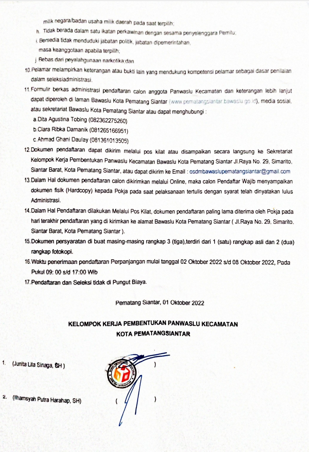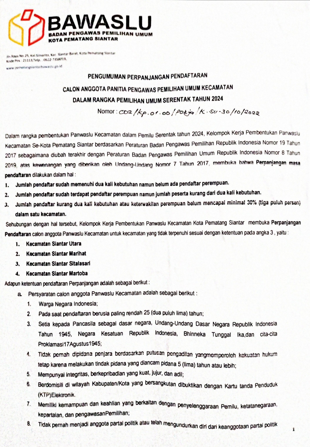 Pematang Siantar,- Keterwakilan 30 persen perempuan pendaftar pada Panitia Pengawas Kecamatan (Panwascam) belum terpenuhi, Badan Pengawas Pemilu (Bawaslu) Kota Pemtang Siantar, memperpanjang masa pendaftaran Panwascam,(01/10/2022).